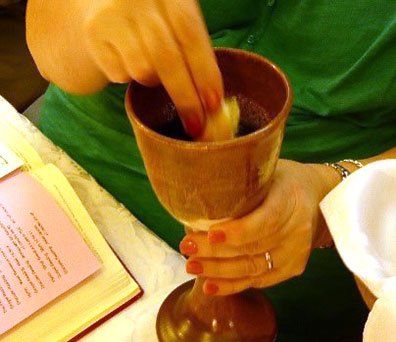 Sometimes the intinction method is used dipping the bread in the juice before eating it.