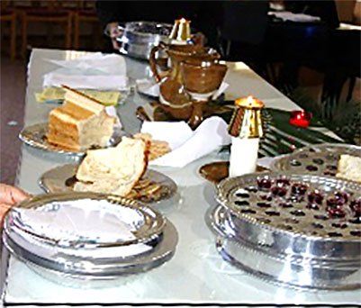 Communion is served by various groups or committees in the church assisting the minister. It is received at two stations, one at the front and one at the back of the church. The bread is received followed by a vial of juice.